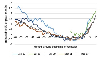 In the case of the US, history suggests that “full employment” is not a sustainable state and that once we reach such a level a sudden increase in unemployment is very likely. In the figure below I plot unemployment rates around the peak of each of the last five cycles (where zero represents the month the recession started). I plot 5 years before the recession started and 10 months after the recession.