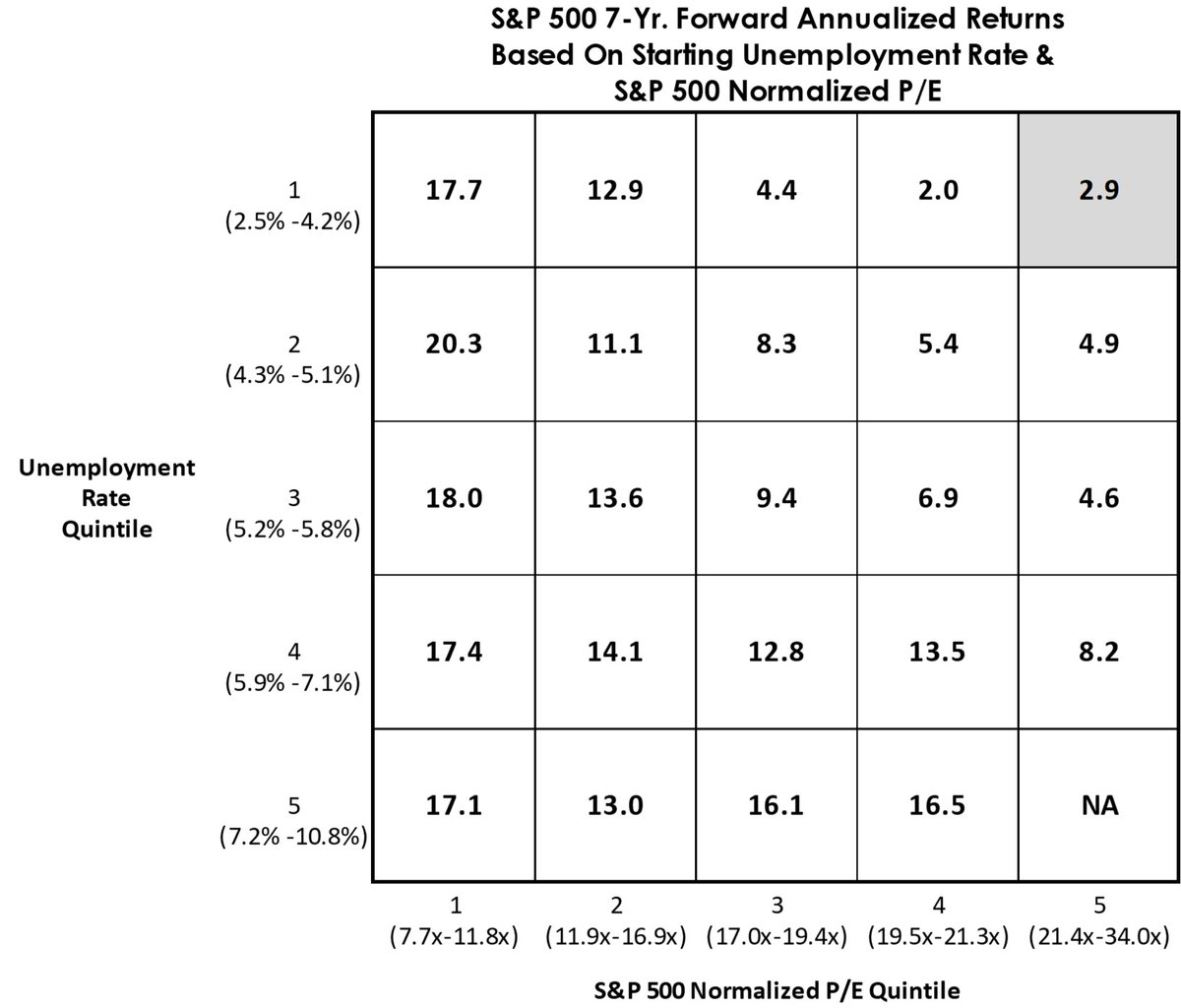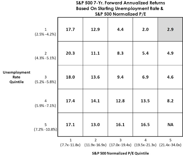 The Leuhold Group also sounded a warning for equity investors. The combination of low unemployment and top quintile valuations is unfriendly for long-term (7-year) returns.