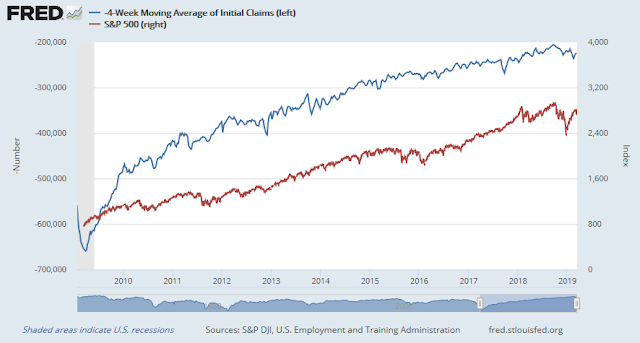 As an indication of the usefulness of the timely initial jobless claims, initial claims (inverted scale, blue line) have been remarkably correlated with stock prices during this expansion cycle.