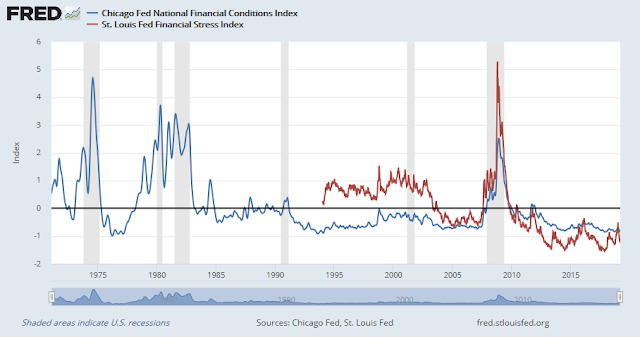 Fatas uses the Chicago Fed’s National Financial Conditions Index (blue line) to measure financial excesses. So far, this indicator, along with the St. Louis Fed’s Financial Stress Index, remains tame.
