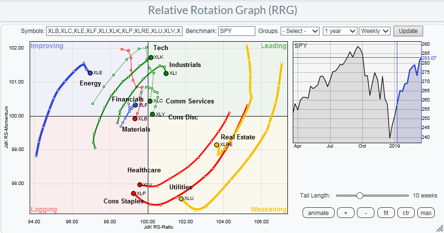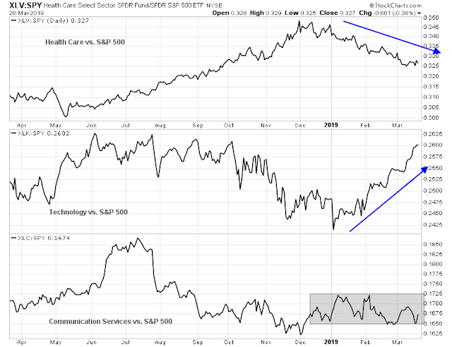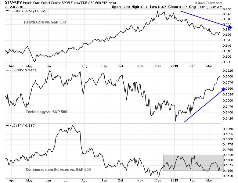 The sector with the most buy ratings is Energy, but I am going to set aside Energy and Materials from this analysis as commitments to those sectors amount to a bet on commodity prices, which has historically been inversely correlated to the USD. As the chart below shows, the USD Index has been range bound since November, and so has the relative performance of Materials. The relative performance of Energy to the market has also been range bound for 2019, despite the rally in oil prices.