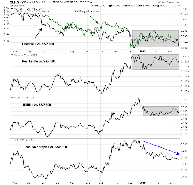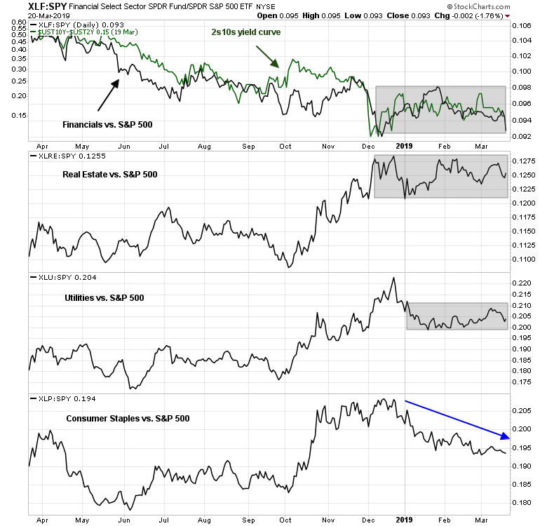 Consider the same analysis for the least favored sectors. Surprisingly, all have been range bound relative to the market, except for Consumer Staples, which has been in a relative downtrend this year. Be aware, however, that the relative performance of Financial stocks have been highly correlated to the shape of the yield curve. A steepening 2s10s yield curve has historically been favorable to the outperformance of this sector.