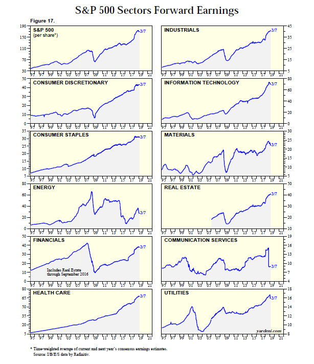 The following chart from Yardeni Research Inc. drills down at a sector level to how forward 12-month EPS estimates have been changing.