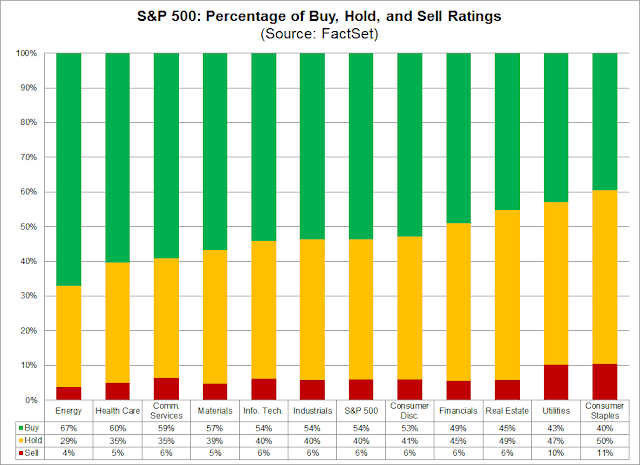 Mid-week market update: The instant market reaction on FOMC day can often be deceptive. Instead of a general market comment, I will focus instead on analyzing sectors using sentiment, momentum, and contrarian approaches. As a measure of sentiment, John Butters at FactSet recently analyzed sectors by the number of buy, hold, and sell rankings.