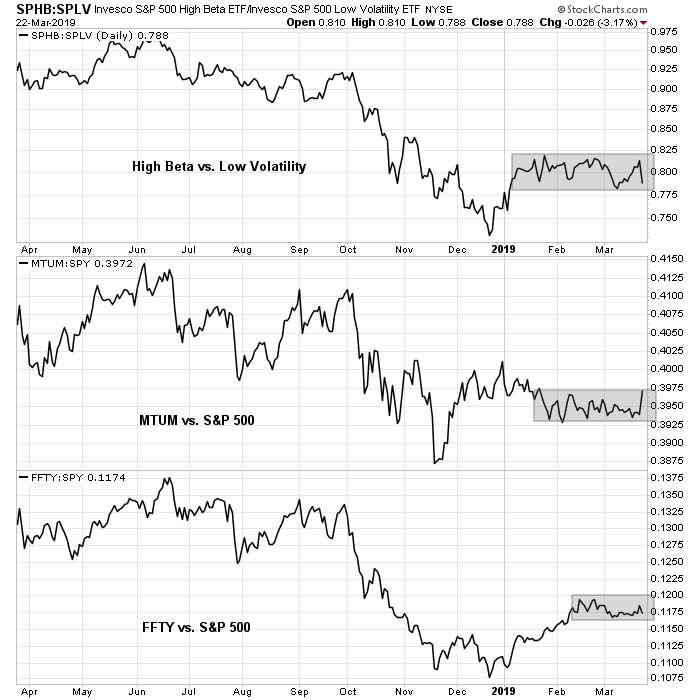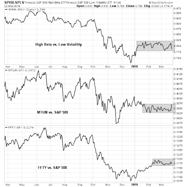 If the bulls were to maintain control of the tape, I would like to see better performance by equity market risk appetite factors. So far, the relative performance of high beta vs. low volatility, pure price momentum (MTUM), blended momentum (FFTY) are all range bound. Can they break out of their ranges? In which direction?