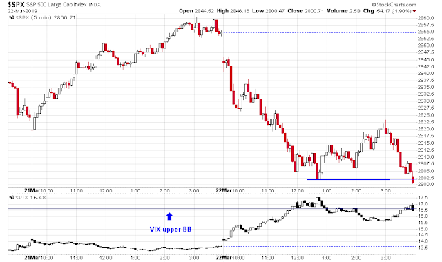 The VIX Index spent much of Friday above its upper BB, which is one mark of an oversold market, but pulled back below the key level just at the close. Here is the 5-minute chart.