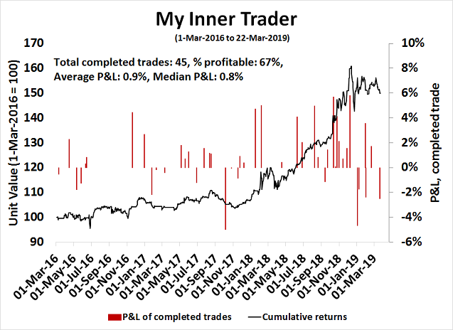 My inner trader uses a trading model, which is a blend of price momentum (is the Trend Model becoming more bullish, or bearish?) and overbought/oversold extremes (don’t buy if the trend is overbought, and vice versa). Subscribers receive real-time alerts of model changes, and a hypothetical trading record of the those email alerts are updated weekly here. The hypothetical trading record of the trading model of the real-time alerts that began in March 2016 is shown below.