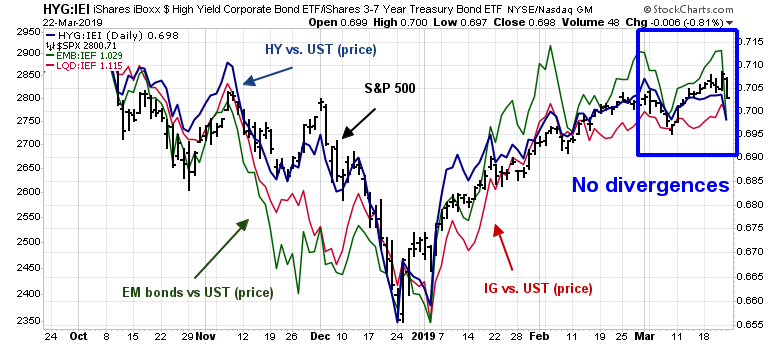 Credit market risk appetite indicators have not given many clues. The duration adjusted price relative performance of high yield (junk bonds), investment grade, and EM bonds are all tracking the stock market. There are no significant divergences.