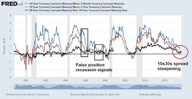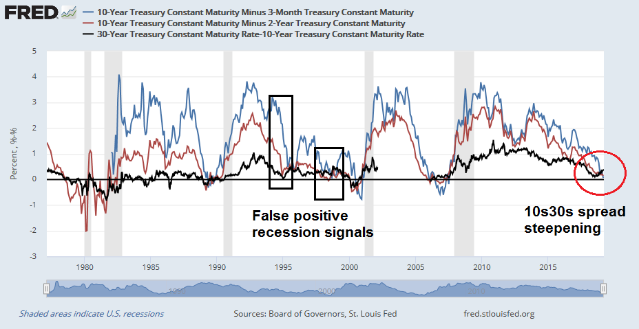 Which yield spread should you focus on? The short end and the belly of the curve, which is most affected by Fed policy, or the long end, which is mostly determined by the market? The answer is both, but I am skeptical of a recession signal from a flattening or inverted yield spread that is unconfirmed by the other, especially when the Fed is dovish. I was far more concerned about recession risk last year when the 2s10s and 10s30s were flattening in lockstep.
