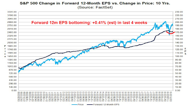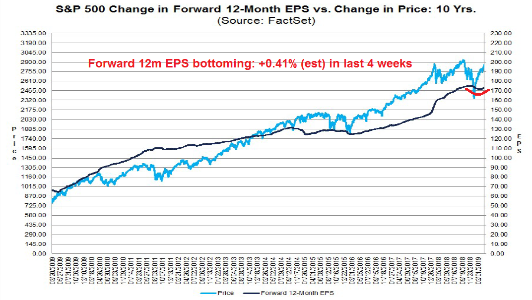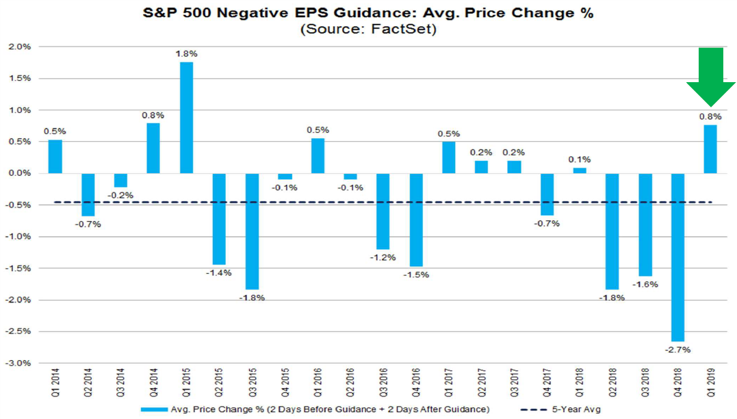 FactSet reported that the market has not been reacting to negative earnings guidance, which may be a sign that a slowdown is already priced in. This interpretation should be given greater consideration as forward EPS estimates are now bottoming out.
