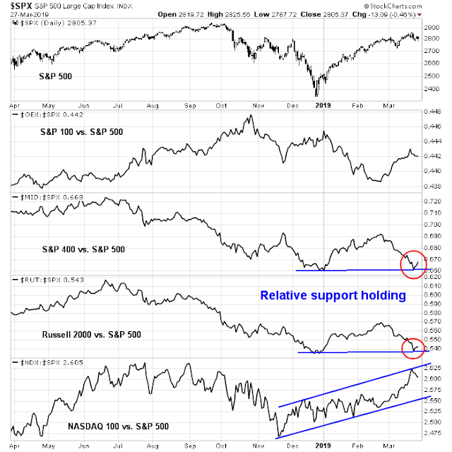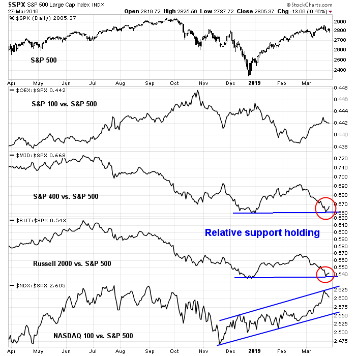 Other market internals are also normalizing. I had expressed some concerns about the relative performance of mid and small cap stocks. These groups bounced off key relative support lines this week and turned up. By contrast, the NASDAQ 100, which had been the past market leaders, started to turn down. NASDAQ stocks appeared a little extended on a relative basis, and the rotation is a sign of a healthy advance.