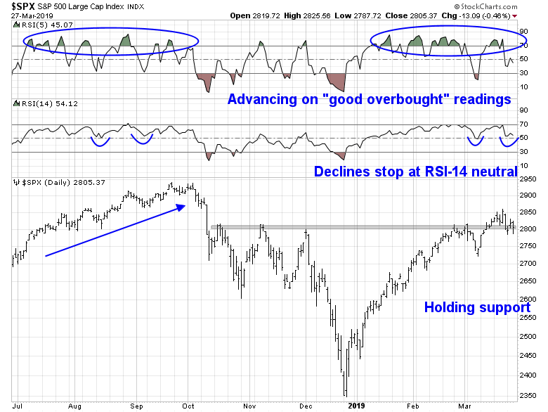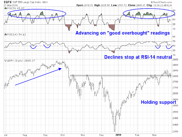 Some of those questions are getting answered. The bulls are still have control of the tape, though the control remains tenuous. The most positive sign is the SPX is holding a resistance turned support zone at about 2800. The market advance last summer was characterized by a series of “good overbought” readings on RSI-5, and pullbacks were halted when RSI-14 reached the neutral zone. The same pattern seems to be occurring today, which is constructive.