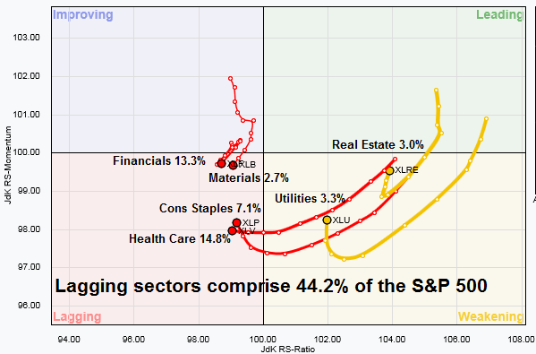 By contrast, the lagging sectors in the bottom half of the chart constitute 44.2% of index weight.