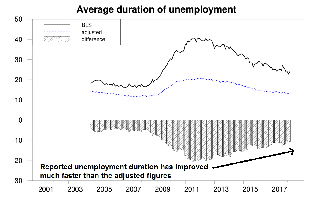 Another effect is the length of unemployment is much lower than reported. More importantly, the bars in the bottom panel show the differences between the reported and adjusted numbers. The takeaway is the rate of improvement in the jobs market is actually not as strong as previously reported (annotation is mine). This result also gives greater ammunition for the doves within the Fed.