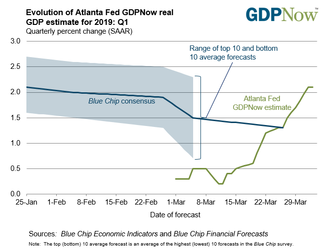 Even the Atlanta Fed’s GDPNow nowcast of Q1 GDP growth has recovered to 2.1% from a near zero reading in March.