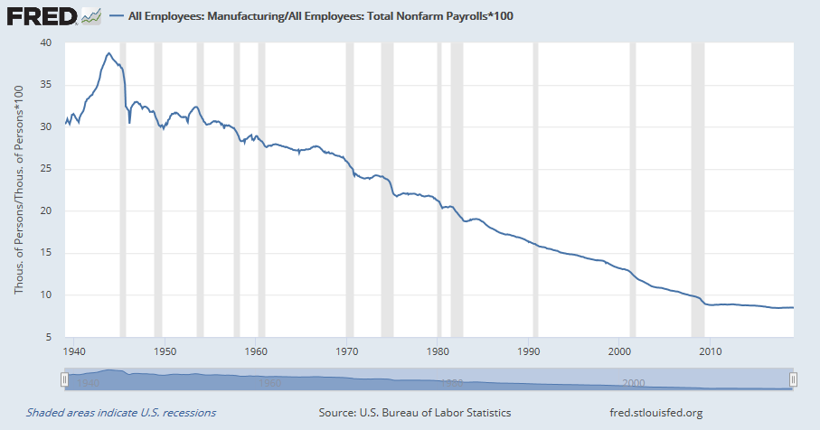 What about manufacturing? The intent of Trump’s trade policy is to bring back manufacturing jobs. The bad news is manufacturing jobs as a % of the economy has been flat. The good news is the multi-decade declining trade trend has been arrested.