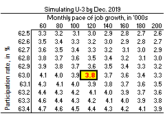 With unemployment at 3.8% (yellow) and participation at 63.0% (vertical), break-even jobs growth – the monthly pace needed to keep unemployment at 3.8% for participation at 63.0% – is only 120k (horizontal). We’re averaging 200k, so U-3 unemployment is likely headed a lot lower.