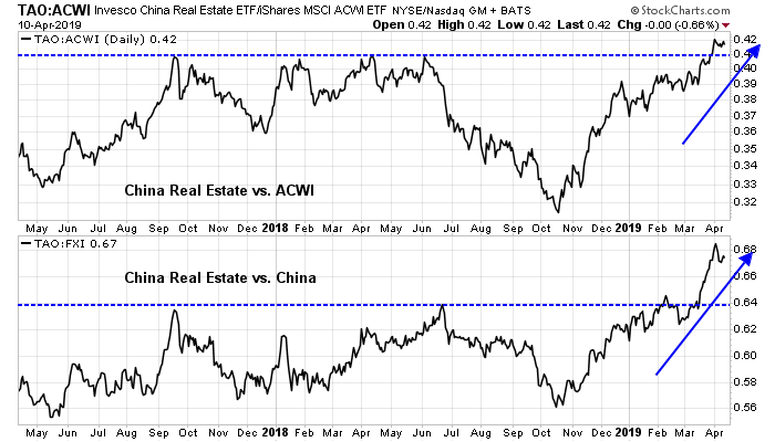 The ACWI relative charts of China and her major Asian trading partners tell another story. The country showing the best momentum is Hong Kong. Despite all the excitement over a US-China trade truce, and China’s stimulus program, the Shanghai market has been range-bound against ACWI for 2019. The other Asian markets are also range-bound relative to ACWI, though two (Singapore and South Korea) are tracing constructive double bottom patterns.