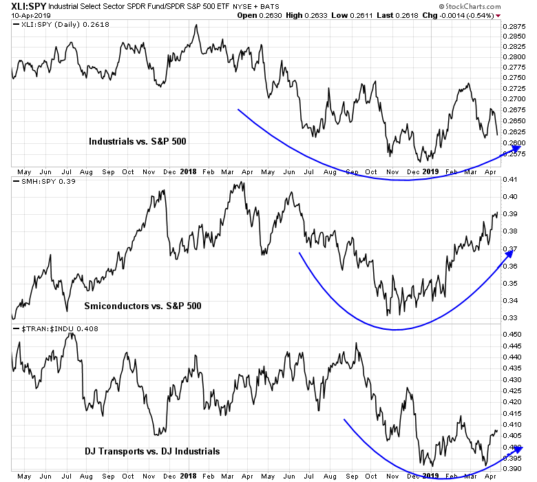 Let’s start in the US. The macro backdrop is a cyclical rebound, and cyclical stocks appear to be the emerging leadership. Industrial stocks (XLI), semiconductors, (SMH) and transportation (IYT) are all turning up relative to the market.