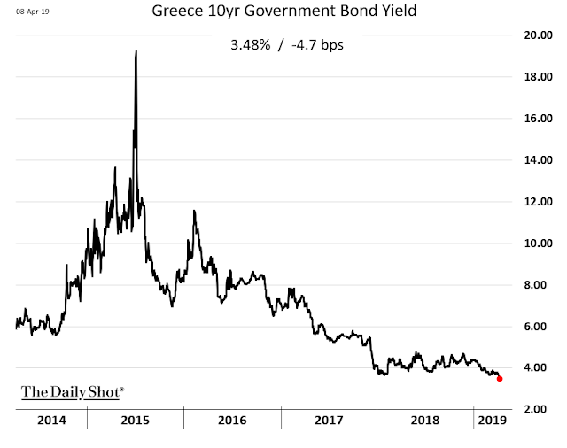 Yes, that Italy. That Greece. For some perspective of how much Greece has recovered, just take a look at this chart of the yield on 10-year Greek debt. In Europe, it seems that the dominant theme is contrarianism and financial healing.