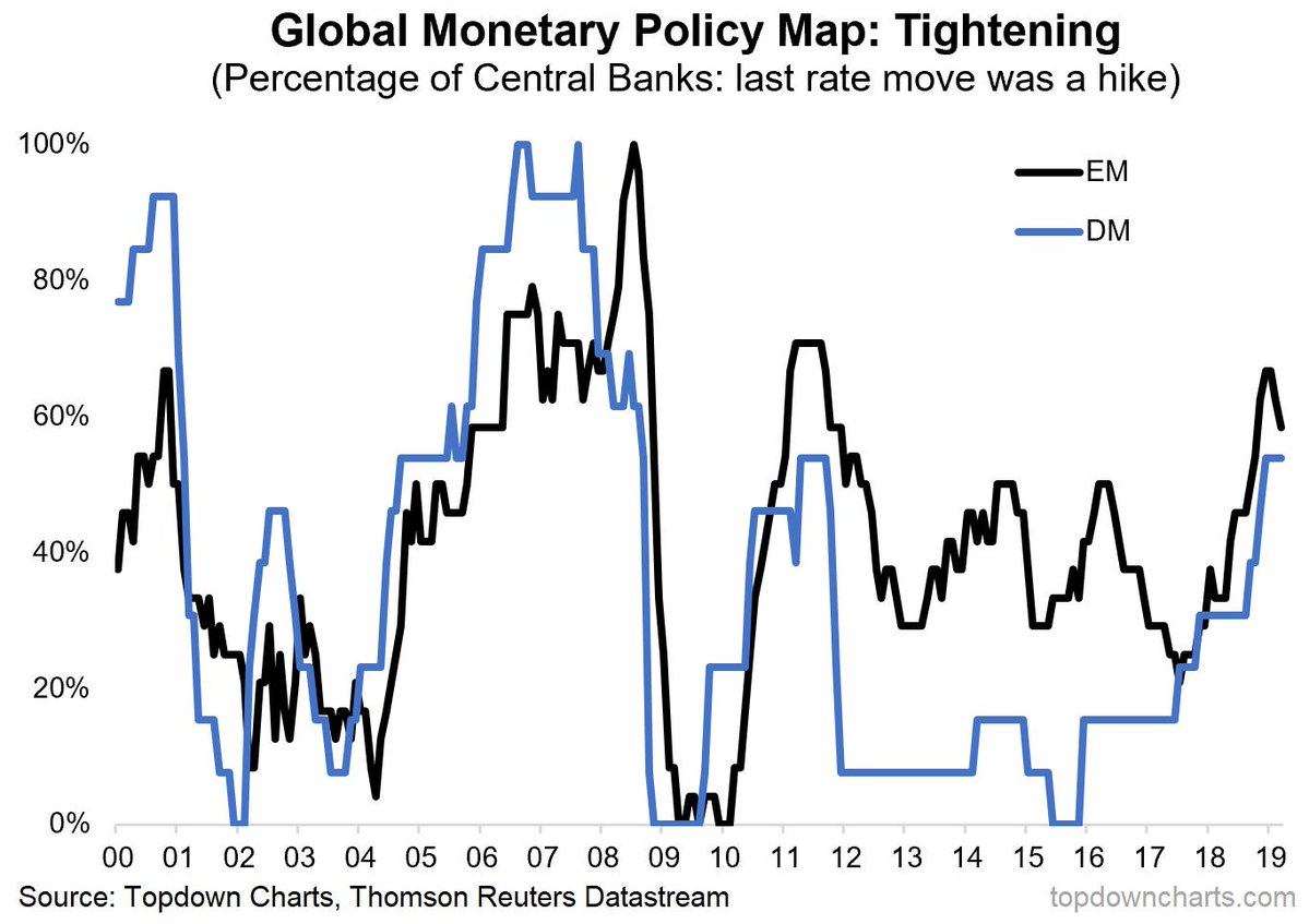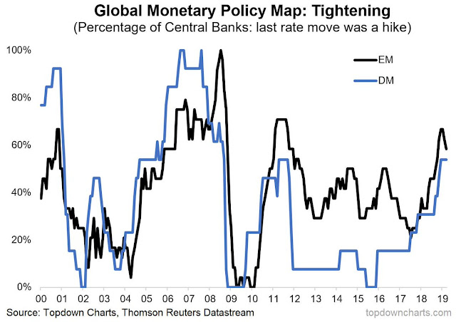 However, rising bond yields are not necessarily fatal to stock prices. One possible template for today’s market may be the late 1990’s. The 2s10s yield curve inverted during the summer of 1998, but it was unconfirmed by the 10s30s yield curve. Today, the 3m10y yield curve inverted, but the 2s10s did not, and the 10s30s had been steepening, instead of flattening. While the 2s10s spread is about 15bp, the 10s30s is over 40bp, which is a highly definitive repudiation of the yield curve inversion or flattening message. In both instances, the Fed stepped in. In 1998, it was in response to the Russia/LTCM Crisis. Today, the Fed made an abrupt policy U-turn to become “patient”. What’s more, global monetary policy has also begun to turn away from tightening.