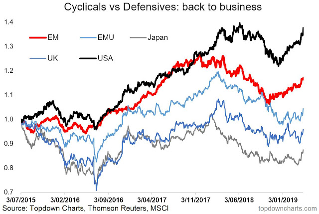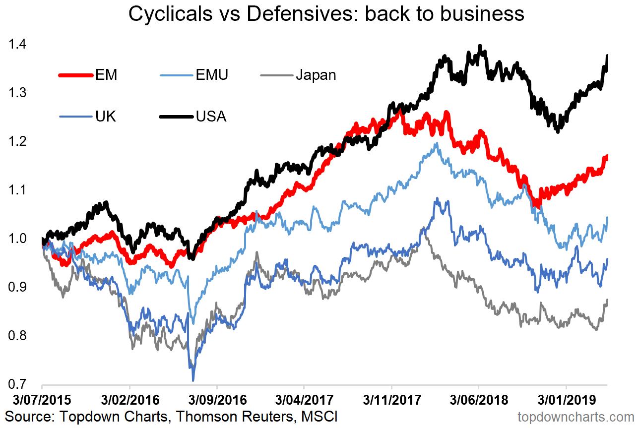 Callum Thomas also pointed out that the relative performance of cyclical to defensive stocks are rebounding all around the world.