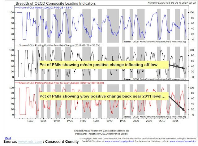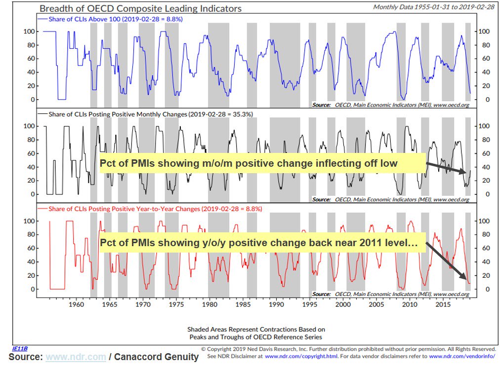 However, a number of global “green shoots” are appearing. Tony Dwyer of Canaccord Genuity observed that while global PMIs are falling, PMI breadth (middle panel) is starting to improve.