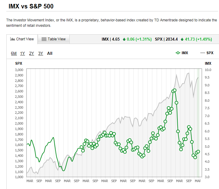 Similarly, the TD-Ameritrade Investor Movement Index, which measures how the firm’s clients are acting in their accounts, shows that bullishness is recovering, but readings can hardly be described as a crowded long.