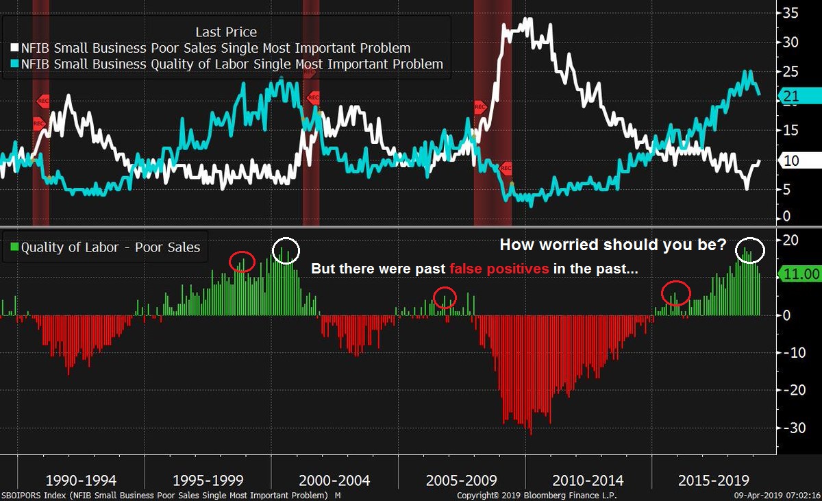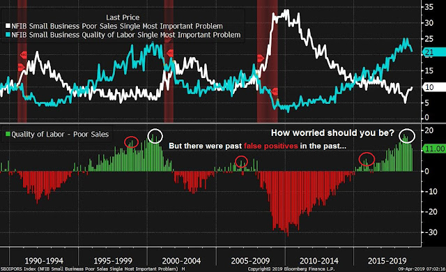 Another worrisome sign appeared with the latest monthly NFIB small business survey. Small businesses can be regarded as sensitive economic barometers and the canaries in the coalmine because of their lack of bargaining power. Joe Wiesenthal at Bloomberg pointed out that small businesses who cite “poor sales” as their biggest problem (white line) has been ticking up, while businesses who cite “quality of labor” as their biggest problem (cyan line) has been falling. The bottom panel of the chart below shows the spread between the two series. While NFIB data can be noisy, and this indicator has flash false positive signals of economic weakness (red circles) in the past, this is something to keep an eye on.