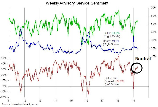 Similarly, Investors Intelligence sentiment, as measured by the bull-bear spread, is firmly in neutral.