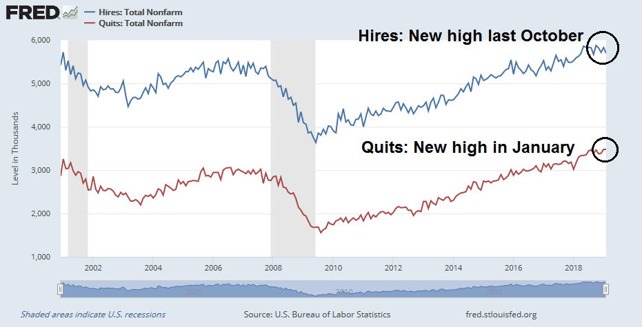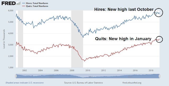 I tend to discount the job openings number as noisy and unreliable because employers have advertised job openings when there are no jobs available in order to troll for resumes. The actual hires and quits figures from the same JOLTS report did not show a rapidly deteriorating job market. Hires made a new cycle high last October, and quits made a new high in January. Neither have fallen as dramatically as job openings. Does this look like the picture of a labor market falling off a cliff?