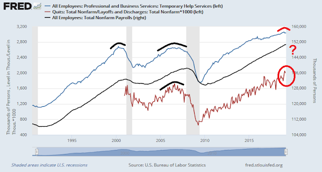 To be sure, there are some signs of wobbles in the labor market. Historically, temporary jobs (blue line) have led the headline Non-Farm Payroll figure (black line) by several months, and the March Jobs Report shows that temp job growth is stalling. However, a BLS study found a similar leading/lag relationship between the quits to layoffs ratio (red line) and NFP. The latest JOLTS report shows is not confirming the weakness in temp jobs. There is no need to panic, but we will have to keep an eye on these indicators.