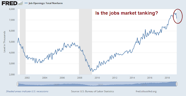 Let’s start with an analysis of the labor market, as that is one of the Fed’s key indicators of the economy. Some concerns were raised by the release of the JOLTS report last week, as the headline job openings figure plunged.