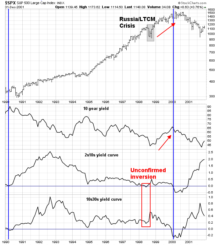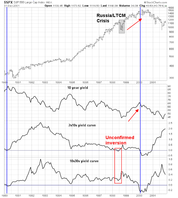 Here is what happened next in 1998. Growth began to recover, and the 10-year yield rose as a consequence, but stock prices also rose in response to the growth recovery and the Fed’s easy monetary policy, until the ultimate NASDAQ Bubble Top in early 2000.