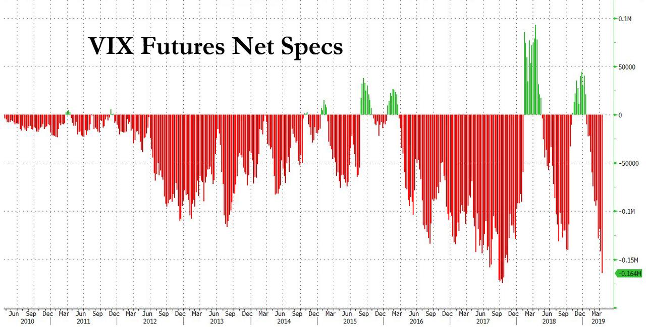 Traders remember the VIXmageddon event of early 2018. Everybody and his brother had shorted the VIX index, and it was easy money until the music stopped. It’s happening again. Zero Hedge, which is our favorite supermarket tabloid for the perma-bear set, pointed out that the Commitment of Futures report shows an extremely crowded short position in VIX futures.