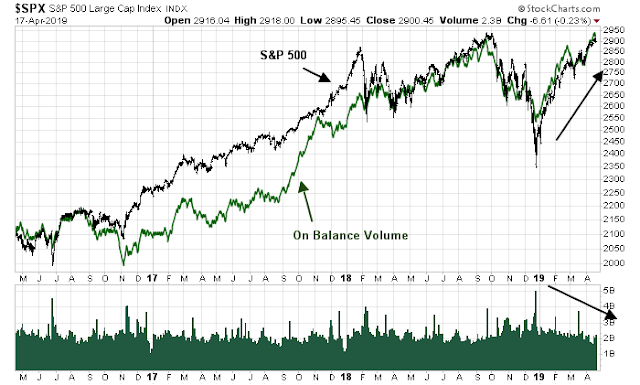 One of the adages of technical analysis is price follows volume. The current advance on low volume has raised concerns about a negative divergence. Joe Granville codified volume measures with his On Balance Volume Indicator.