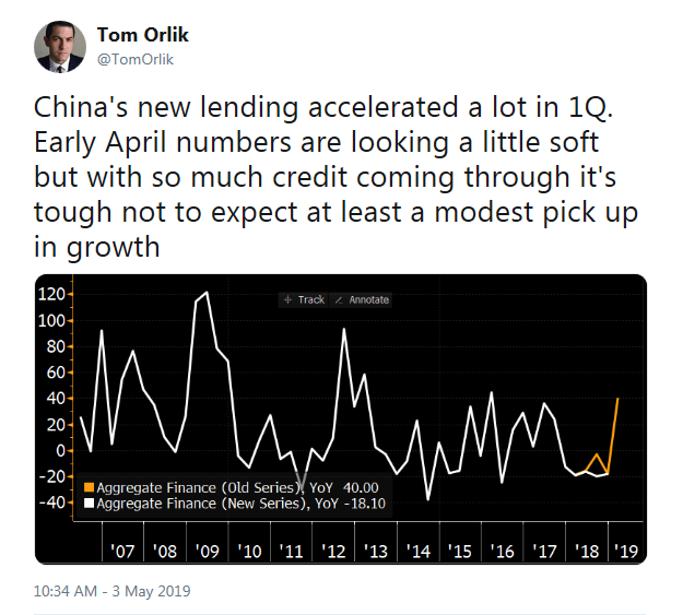 Let us start by examining how strong a hand each side thinks it holds. China’s official and Caixin PMI softened in April, indicating that the effects of the last stimulus program may be petering out. On one hand, they may be waiting for a trade deal as another way of boosting their economy ahead of the October celebration of the 70th anniversary of the founding of the PRC.