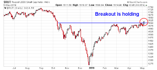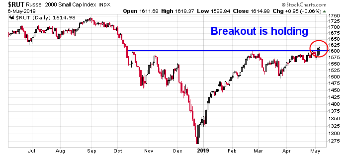 The small cap Russell 2000 staged an upside breakout on Friday. Not only did the breakout hold, the index rose further today, indicating further strength and momentum.