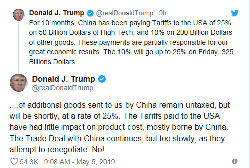 Notwithstanding his misunderstanding that tariffs are not paid by the Chinese, but American importers, this tweet sounds like an effort to put pressure on China, just as Vice Premier Liu He is scheduled to arrive in Washington on Wednesday with a large (100+) trade delegation for detailed discussions. News reports indicate that both sides have given significant ground, and a deal may have been possible by Friday.