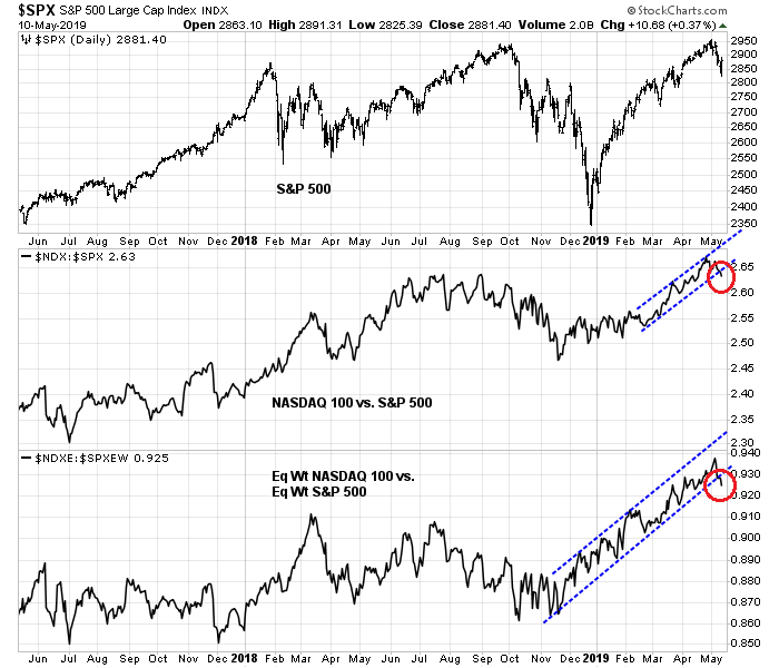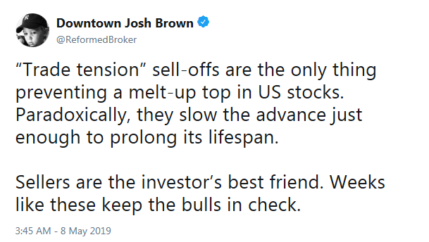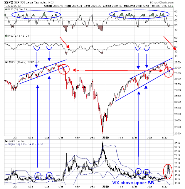 When the news of Trump’s about face on trade negotiations broke, I suggested waiting for the market reaction first before reacting, as the news flow was rapid, and headline risk was high. By Thursday, the technical condition of the market had dramatically deteriorated. The S&P 500 had broken down out of a rising uptrend, indicating the steady advance is over. The last episode of a broken uptrend saw the start of the mini-bear that culminated in the panic bottom on Christmas Eve. Could it happen again?