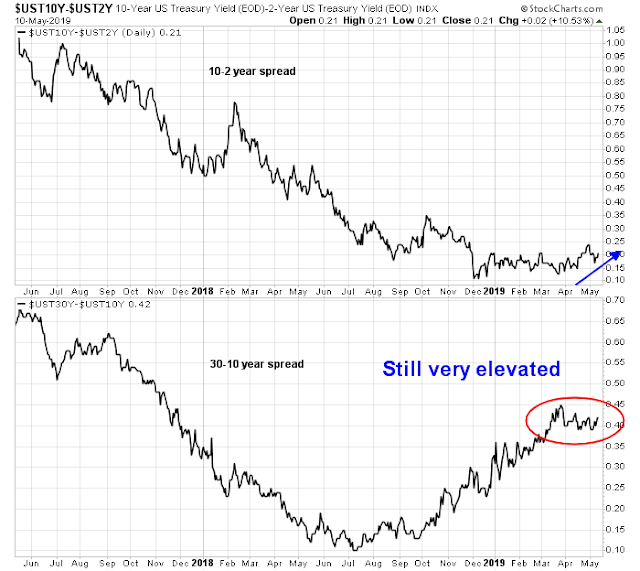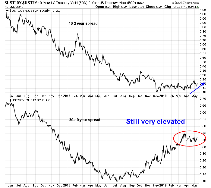 Another item to watch is the message from the credit market. Despite last week’s near inversion of the 10-year to 3-month rate, the 2s10s yield curve has steepened during this episode, indicating better growth expectations. The 10s30s remain elevated, and it is not signaling a slowdown.