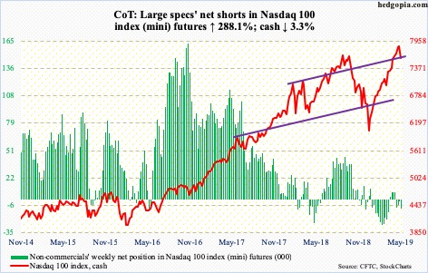 The latest Commitment of Traders report shows that large speculators, which are mostly hedge funds, are short the high beta NASDAQ 100.