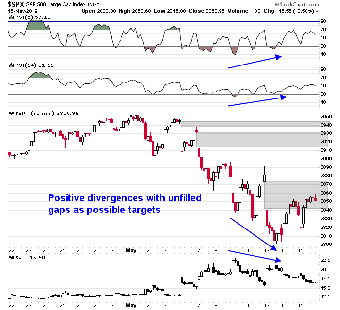 Even as the index fell, both the 5 and 14 hour RSI made higher lows and higher highs. In addition, the VIX Index failed to make a higher high even as prices declined. Possible upside targets are the three gaps left open in the last few days.