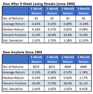 The headlines blared from Schaeffer’s Research, the Dow hasn’t fallen for five consecutive weeks since 2011. Schaeffer’s went on to torture the data until it talked with a bearish conclusion, based on recent data…