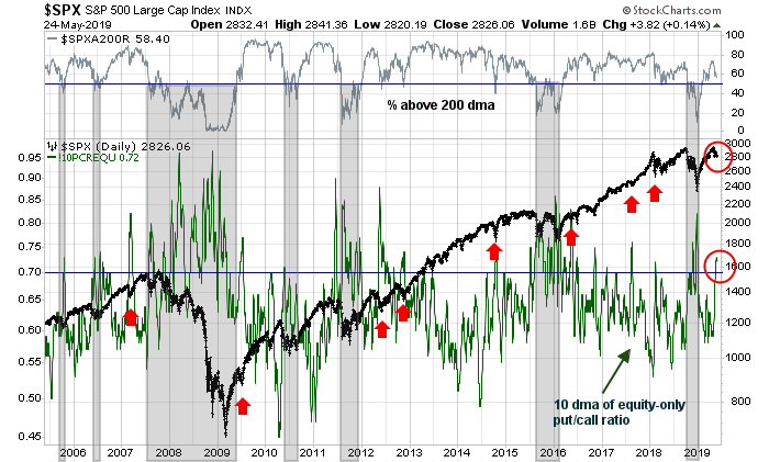 There are indications that fear levels are spiking. The 10 dma of the equity-only put/call ratio rose above 0.70. Past episodes of similar spikes when the market was not in a bear phase, as defined by % above 200 dma below 50%, (shaded regions) have seen low downside risk and V-shaped bottoms (red arrows).