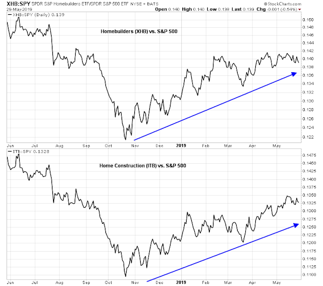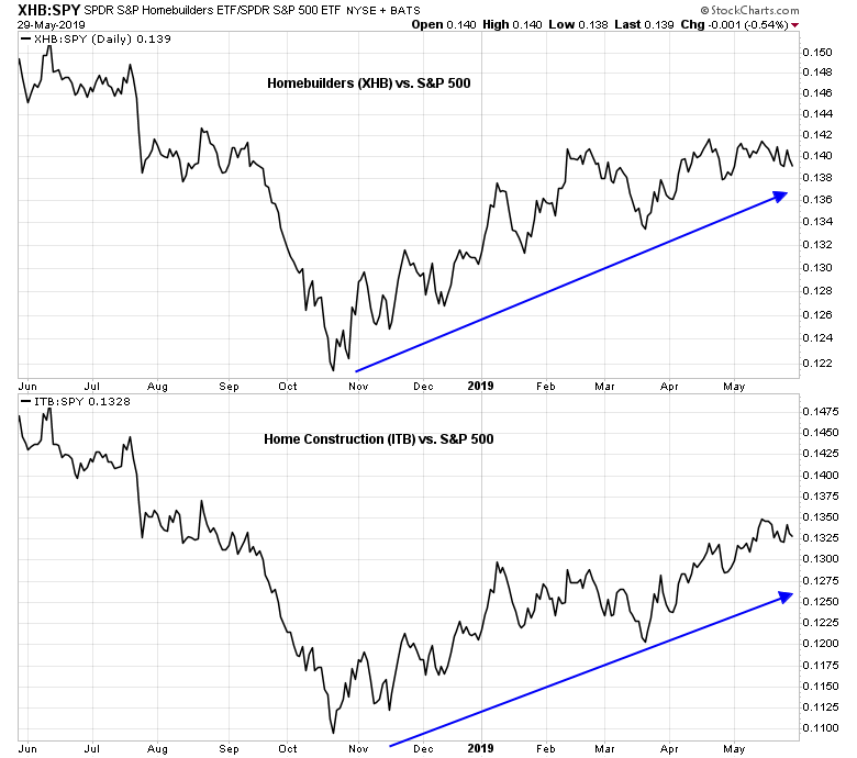Another group to consider are the homebuilders. These stocks have been stealthy relative outperformers since last October. They were beating the market when it was falling, and beating the market when it was rising.
