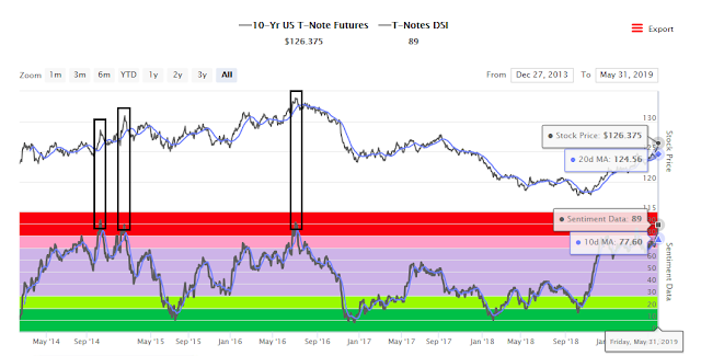 The market stampede into safe havens has been evident. DSI on the 10-year T-Note stands at 92, which is an overbought position that has been resolved with rising rates and price pullbacks.