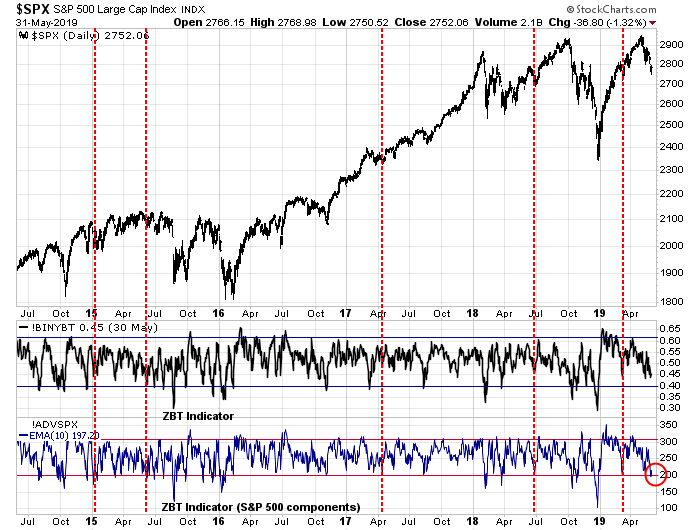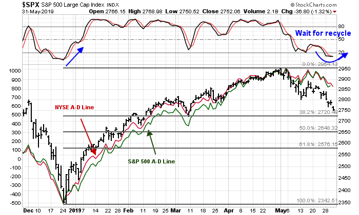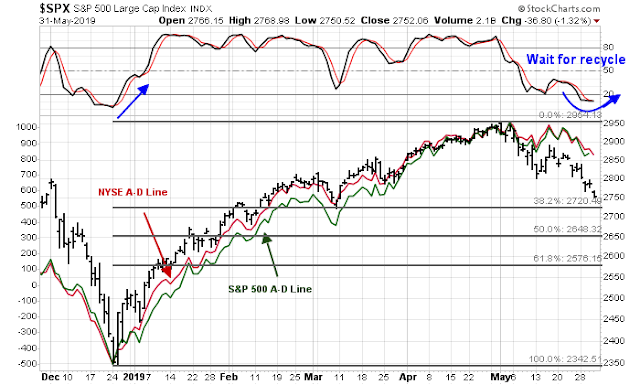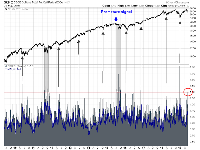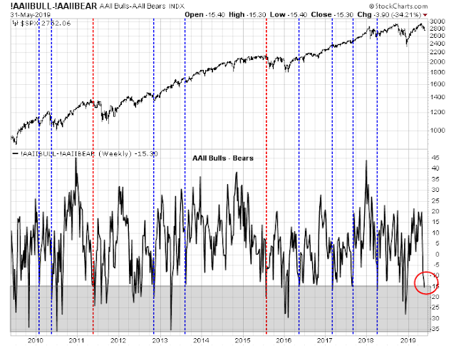 I interpret these conditions as the market poised for an oversold relief rally, but it may need more time to chop around for a few more weeks before a durable bottom is made. From a technical standpoint, the market appeared to be poised for short-term strength Thursday until the Trump Mexican tariffs derailed the rally. At a minimum, traders should not be initiating new short positions at these levels. Even if you are bearish, wait for a bounce first.