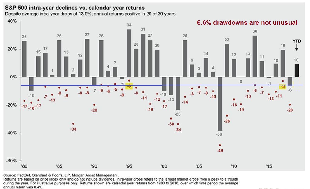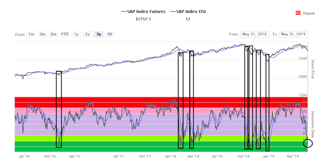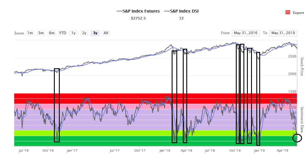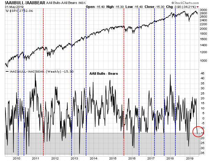 Looking to the week ahead, investors need to take a deep breath and consider the big picture as May was a tumultuous month. The S&P 500 is up 9.8% on a price-only basis for 2019, but down -6.6% from its highs. While drawdowns are always painful and may appear Apocalyptic when you are in the middle of one, 6% losses are not unusual at all from a historical perspective. The market is now oversold, and sentiment is at a crowded short.