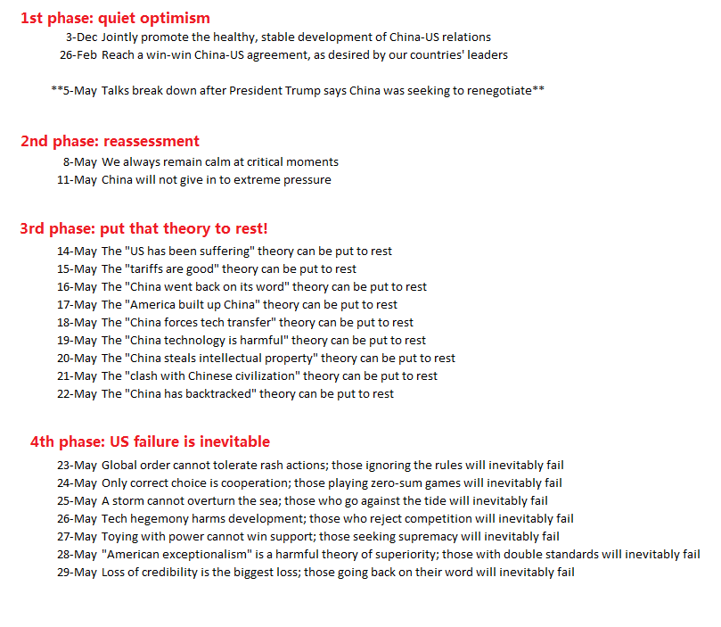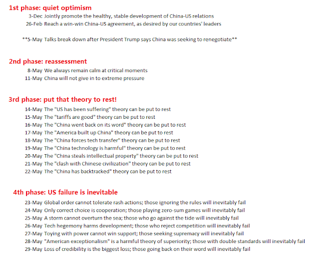 The belligerent tone of the rhetoric has been heating up on both sides of the Sino-American trade dispute. Simon Rabinovitch of The Economist recently documented the different phases and rising stridency of the Chinese response in state-controlled media.